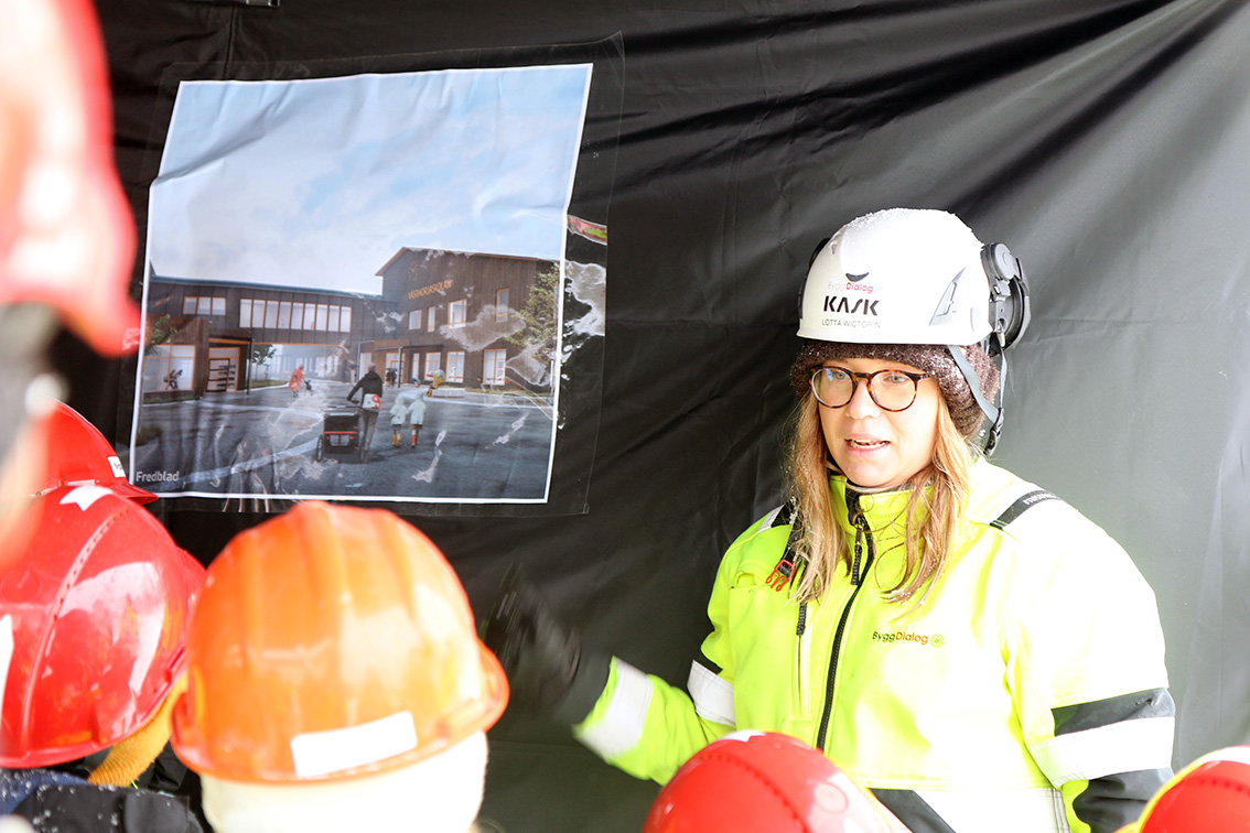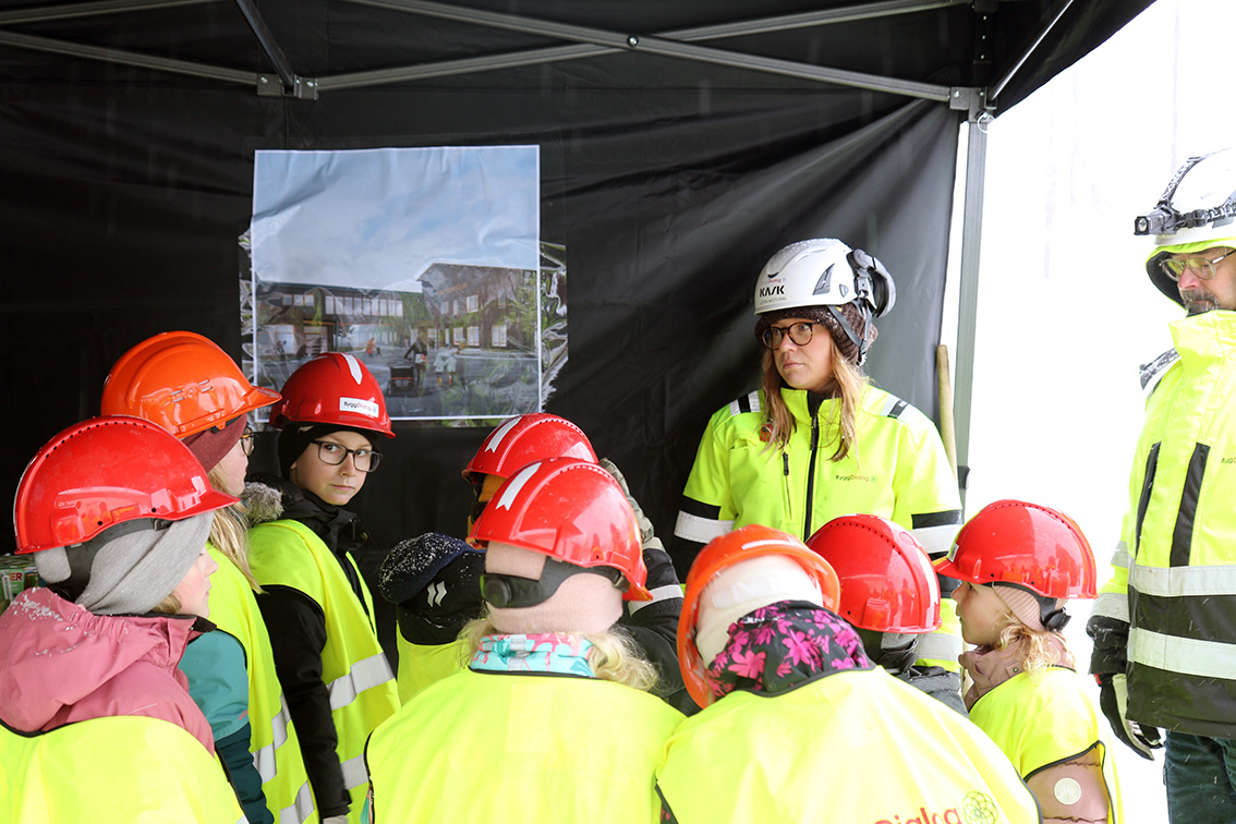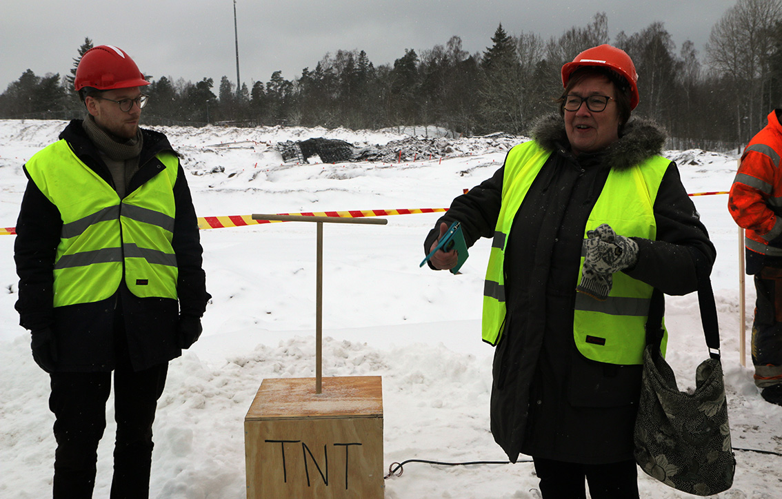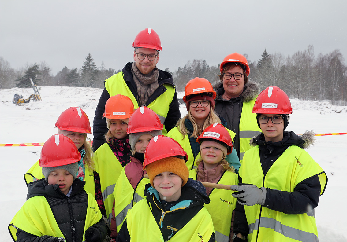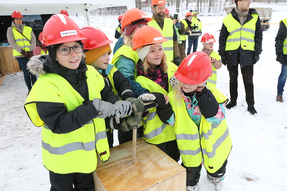 Efter avslutade tal fick åtta barn från Trälleborgsskolan den stora äran att trycka ned avskjutningsknappen. Med en stor smäll inleddes byggprocessen.