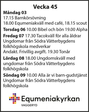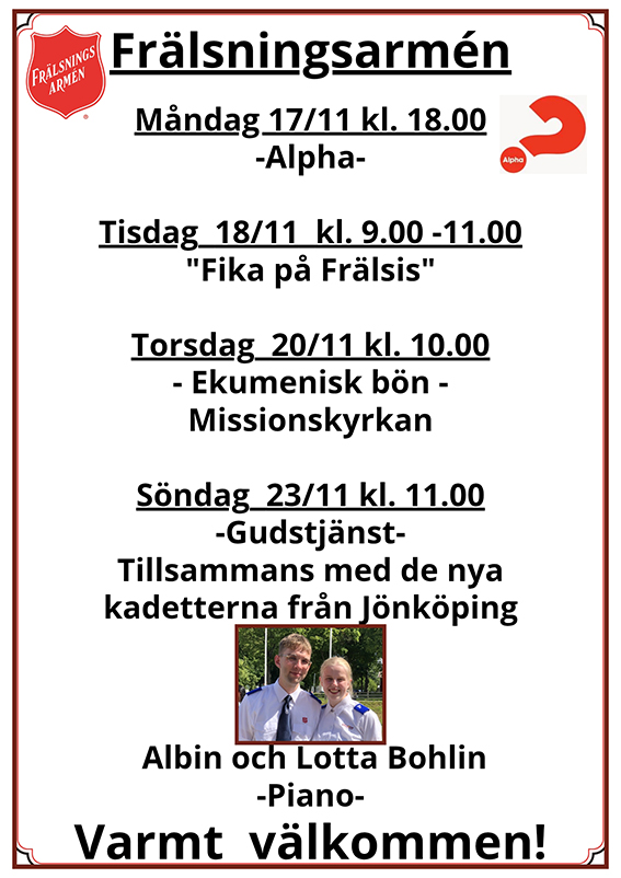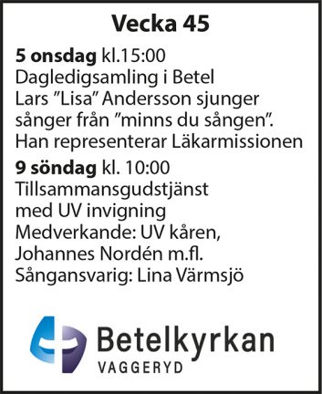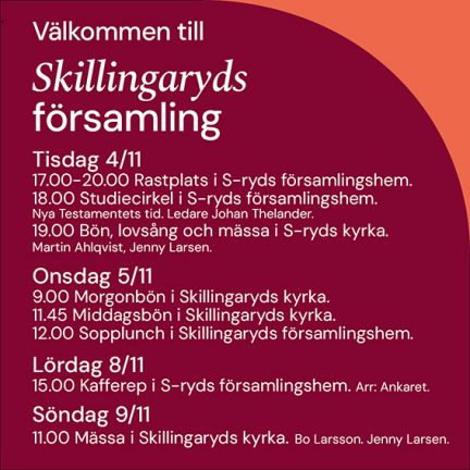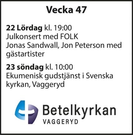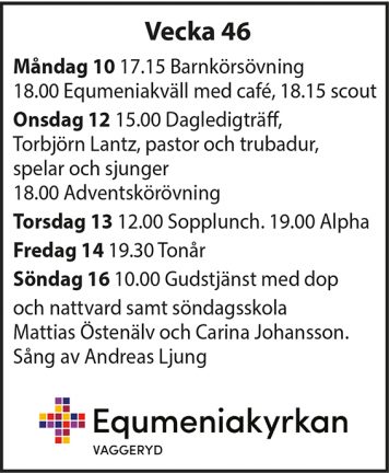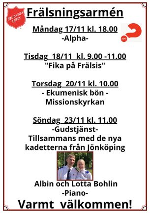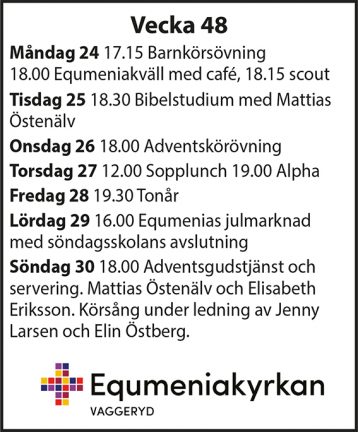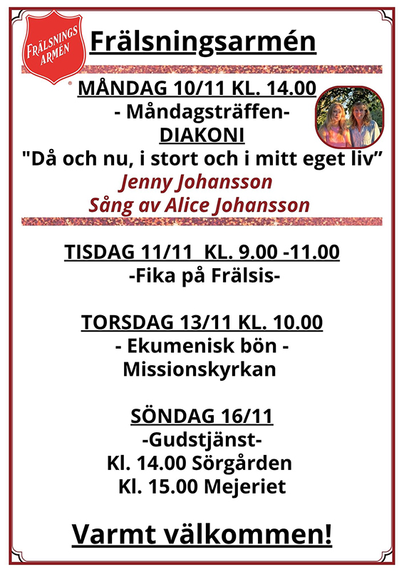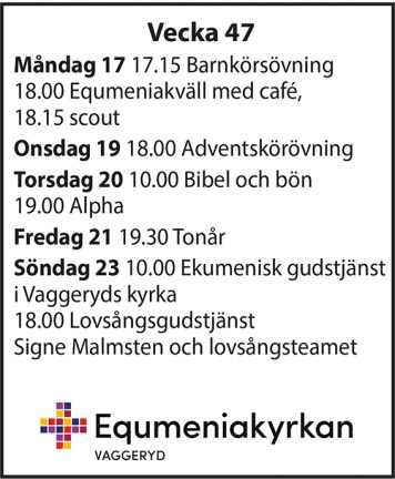 Det händer Veckovis 2025 Lördag 8 november 2025 Söndag 9 november 2025 Måndag 10 november 2025 Tisdag 11 november 2025 Onsdag 12 november 2025 Torsdag 13 november 2025 Fredag 14 november 2025 Lördag 15 november 2025 Söndag 16 november 2025 Måndag 17 november 2025 Tisdag 18 november 2025 Onsdag 19 november 2025 Torsdag 20 november 2025 Fredag 21 november 2025 Lördag 22 november 2025 Söndag 23 november 2025 Måndag 24 november 2025 Tisdag 25 november 2025 Onsdag 26 november 2025 Torsdag 27 november 2025 Fredag 28 november 2025 Lördag 29 november 2025 Söndag 30 november 2025 Måndag 1 december 2025 Tisdag 2 december 2025 Torsdag 4 decmer 2025 Fredag 5 december 2025 Lördag 6 december 2025 Torsdag 11 december 2025 Söndag 14 december 2025 Onsdag 17 december 2025 Torsdag 18 december 2025