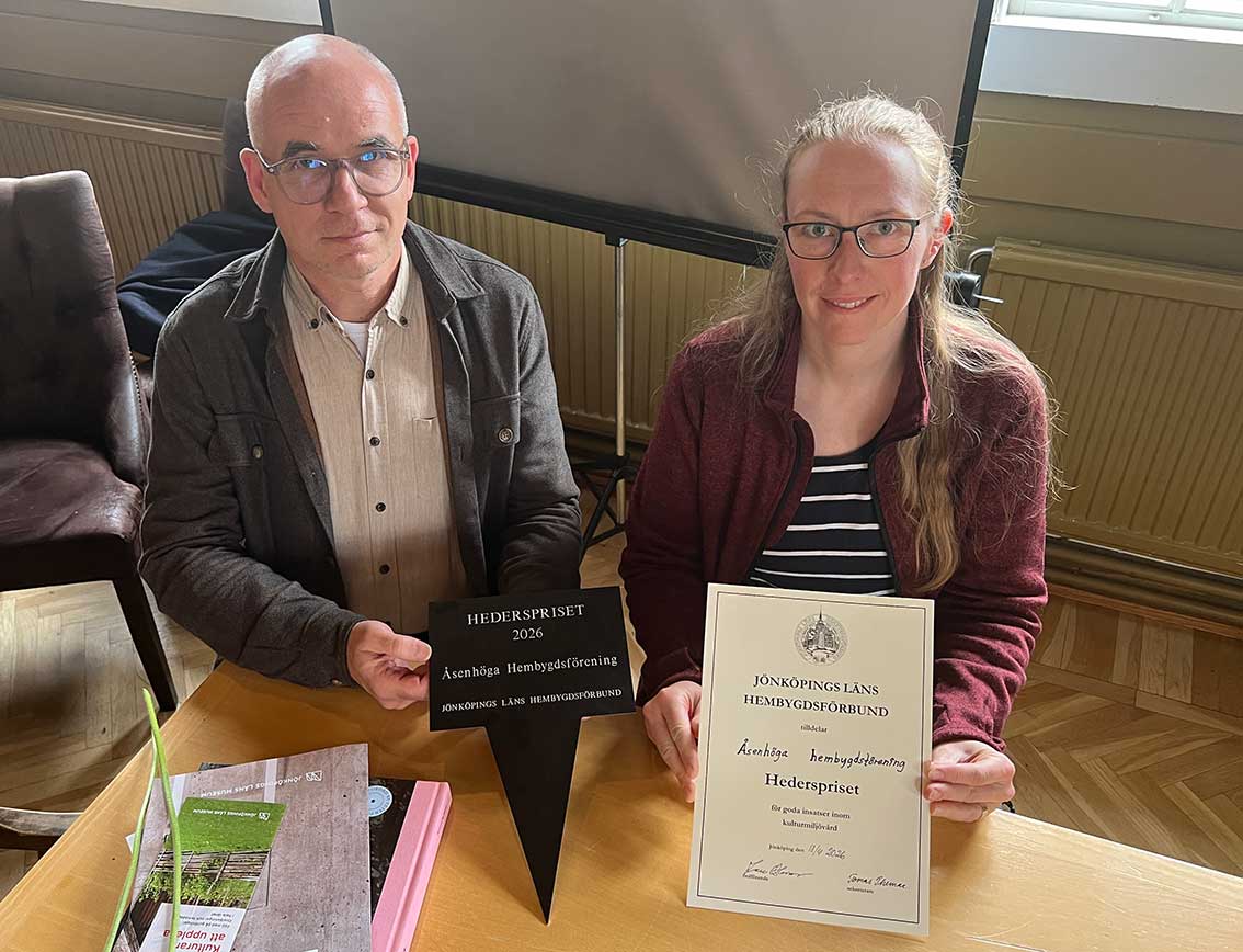 Åsenhöga Hembygdsförening representerades av ordförande Johan Grahn och styrelseledsamoten Åsa Skärvegård. de fick ta emot det hedersfulla priset av länsförbundets ordförande Irene Oskarsson.