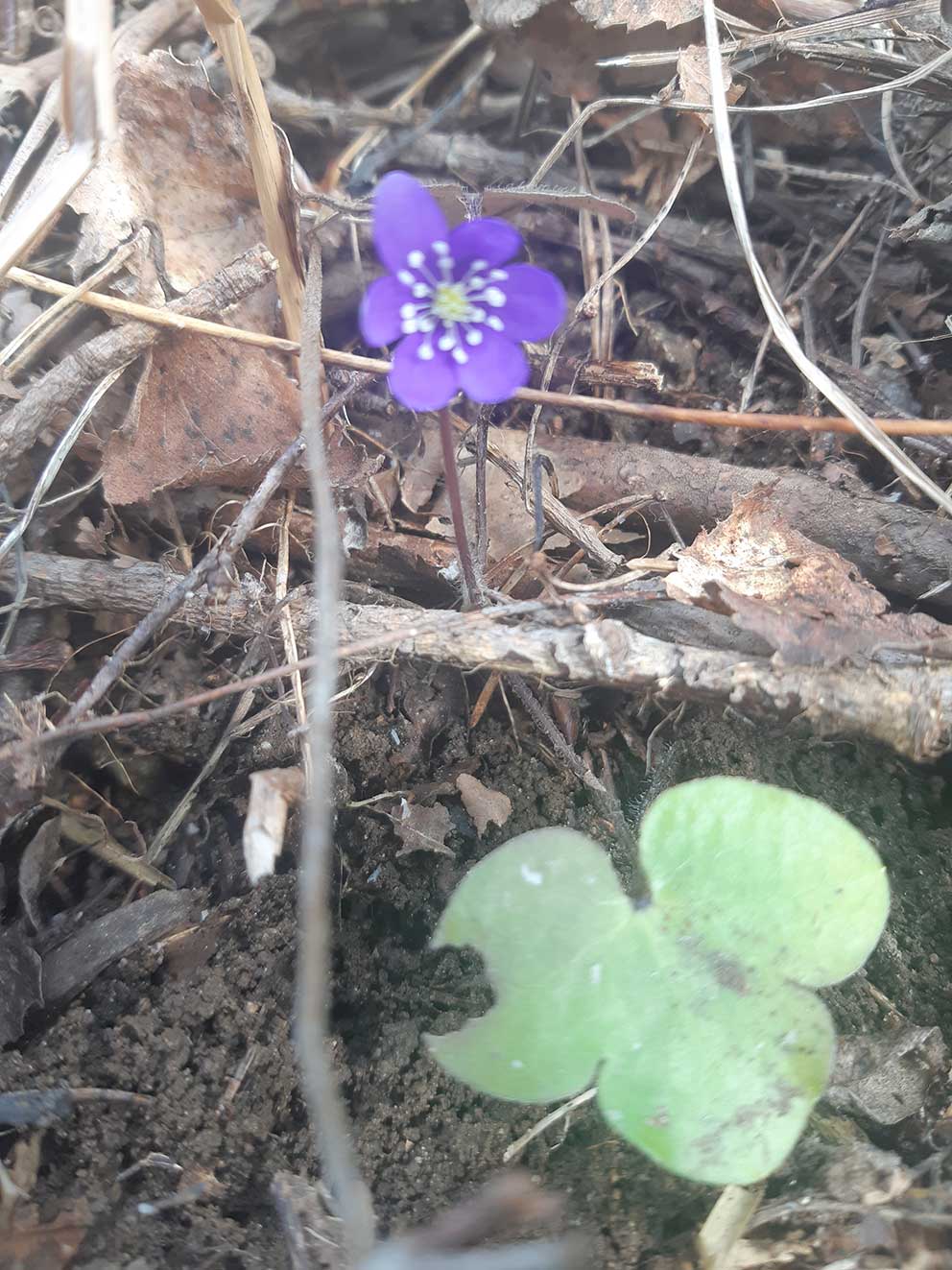 Berit Remnemark i Skillingaryd har fångat första blåsippan för året och hon hälsar att den är vackrast där den står