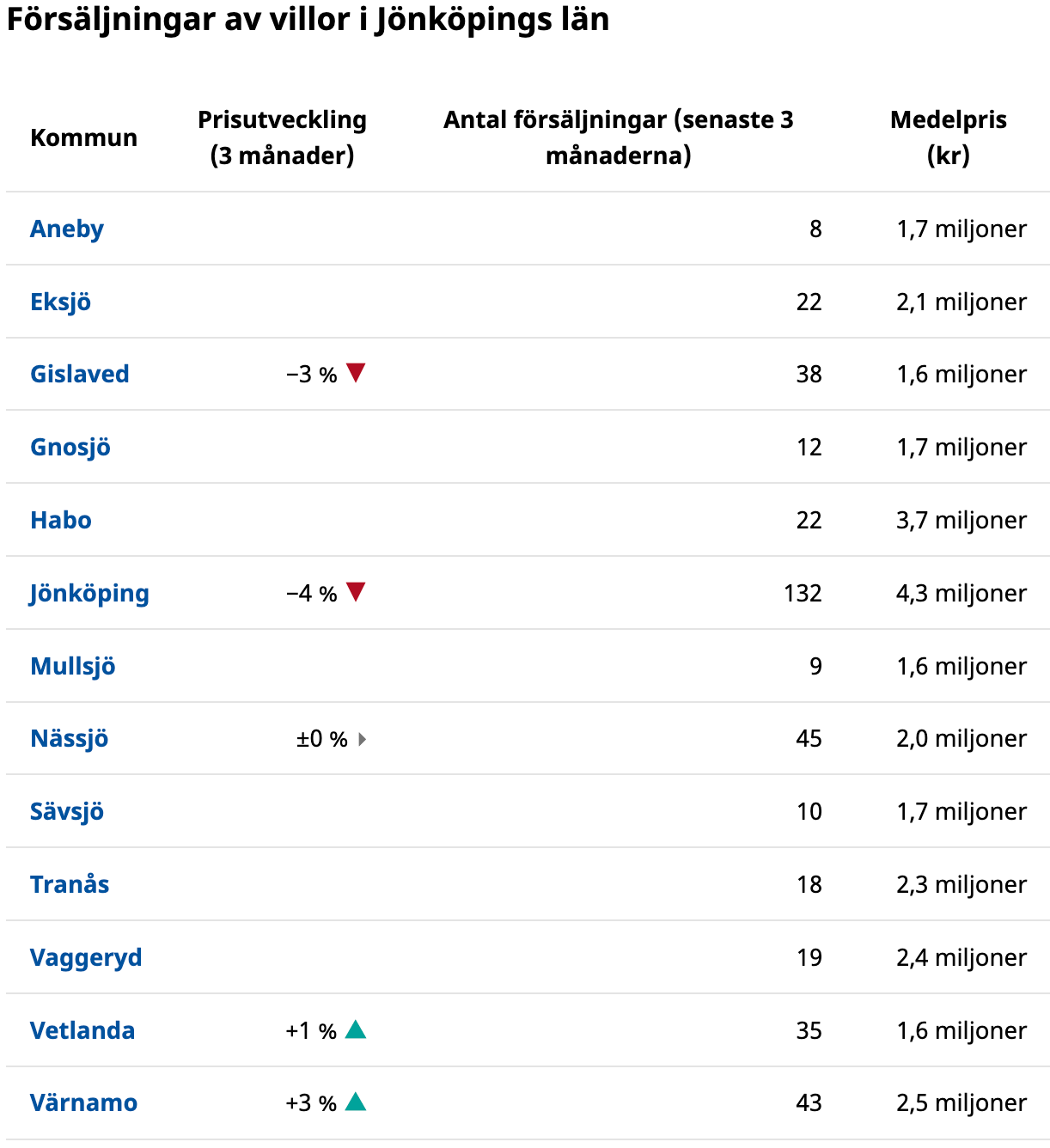 Bland kommunerna i Jönköpings län stiger priserna på villor i två av fem kommuner. Störst var ökningen i Värnamo där priserna steg med 3 procent. I Jönköping däremot sjönk priserna med 4 procent.