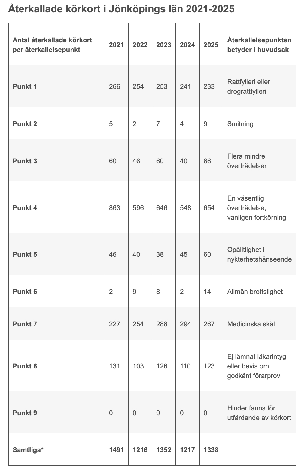 Nyheter Under förra året fattade Transportstyrelsen beslut om 1 338 körkortsåterkallelser i Jönköpings län. Det är en ökning med cirka 10 procent jämfört med 2024. Som vanligt är den dominerande orsaken någon typ av allvarlig trafikförseelse som fortkörning.