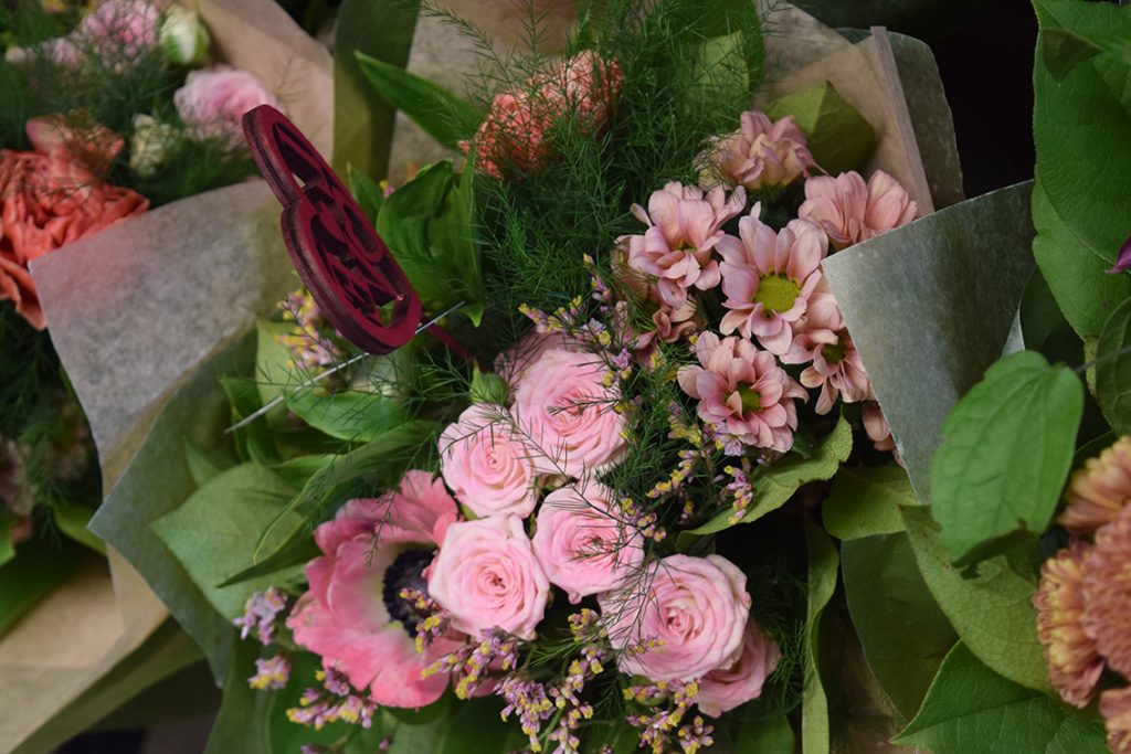 – Här köper man en bukett som med kunskap och hantering ska få blomman att stå sig så länge som möjligt. Vi taggar och bladar av, satt den i rent och fräscht vatten, bundit med andra blommor/grönt.