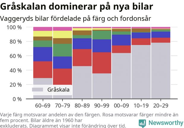 De flesta bilägare i dag väljer en bil i gråskala. Om vi enbart tittar på nyare bilar, max fem år gamla, är 78 procent i Vaggeryd svartvita. Motsvarande siffra för bilar tillverkade kring millennieskiftet, med tillverkningsår 1999–2004, är 53 procent.