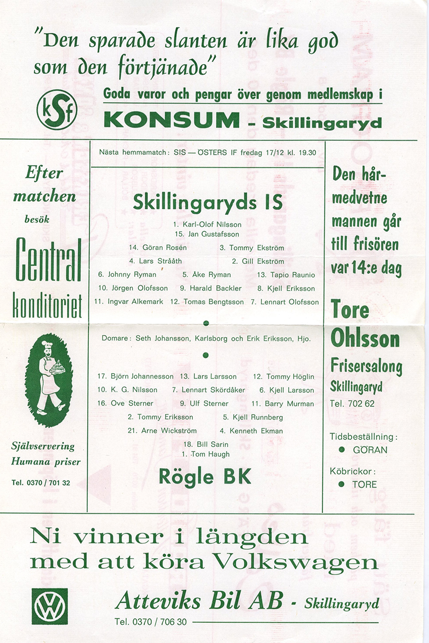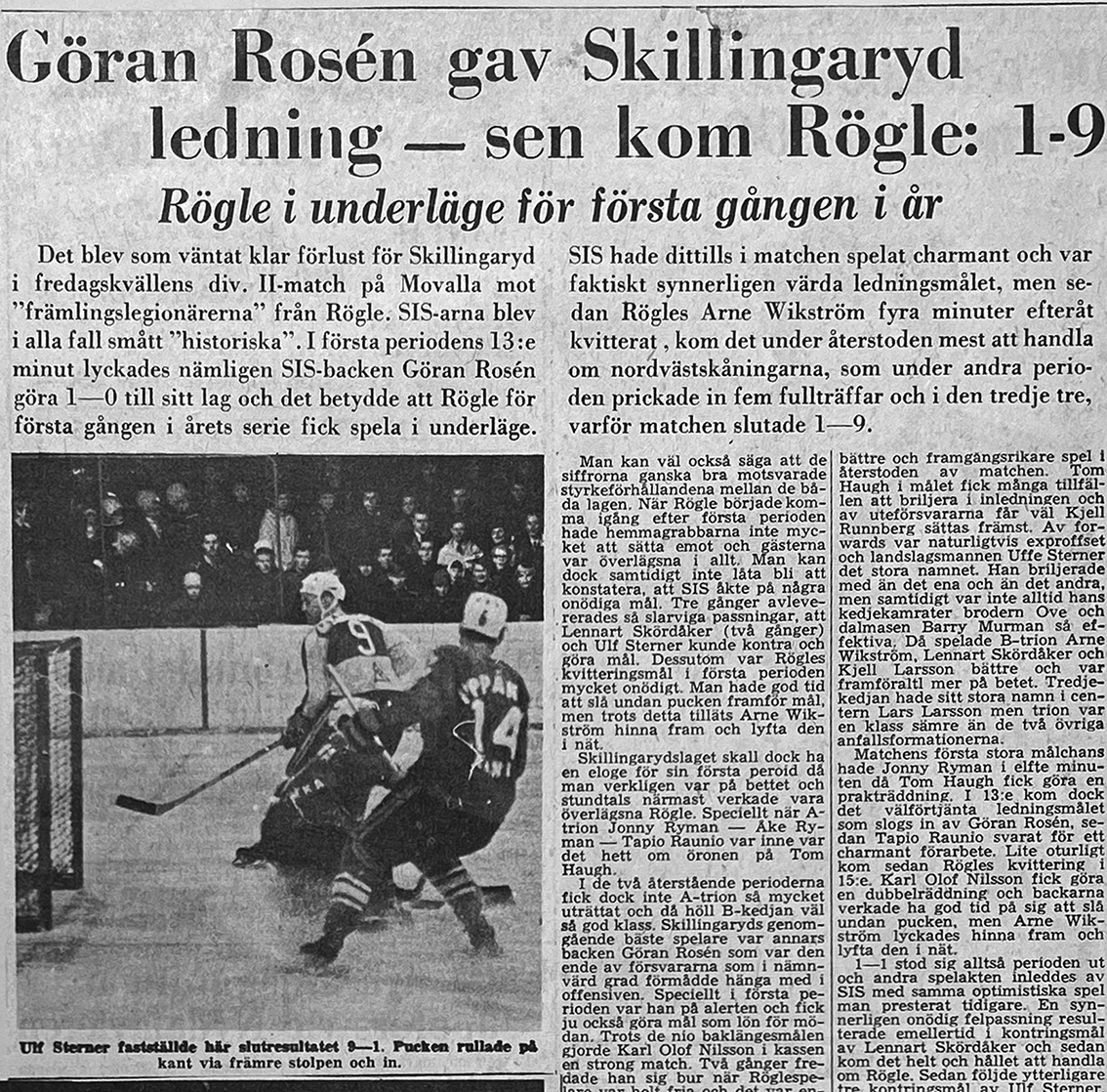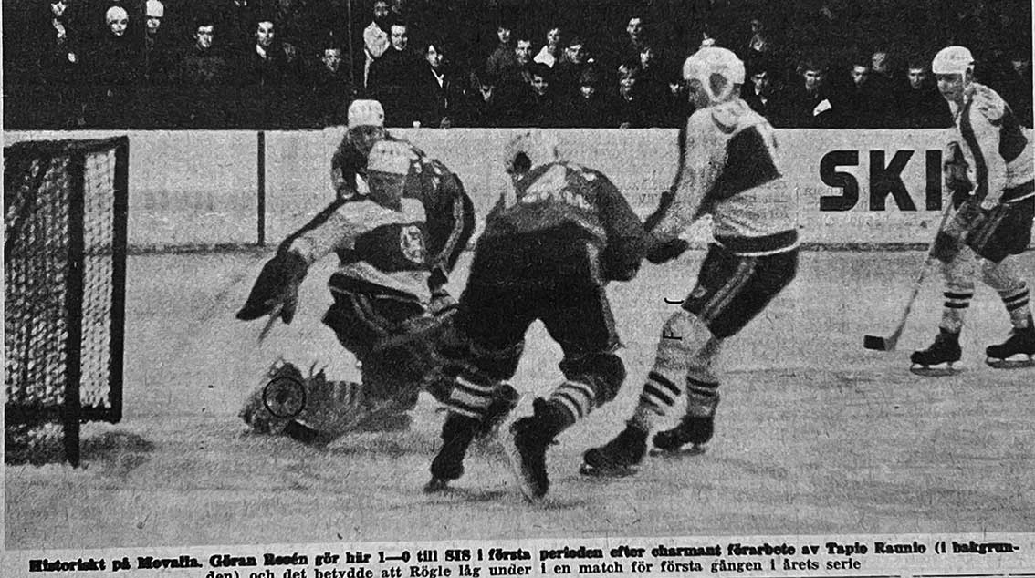 Många som är plus 70 minns matchen och det gör jag själv också. Jag stod alldeles väster om spelarbåsen så nära sargen som möjligt. Efteråt fick jag autografer av flera spelare i Rögle. De här autograferna, plus mycket annat, försvann vid ett inbrott på 1990-talet.