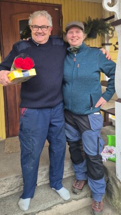 Bengt tar emot utmärkelsen av ordförande Maria Rodén och uppvaktas med blommor och choklad.