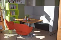 – Det blev bra, det har varit jätteroligt att få vara med från början av byggprojektet och det är lite annorlunda än att vara i Skillingehus där man inte gjort någonting på länge. Vi började flytta hit böckerna 12 mars så vi har jobbat snabbt när vi väl fick nycklarna. Vi har jobbat paralellt med byggjobbarna och i fredags var det ventilatiosfirma, elfirma, byggfima, städ och låssmeden samt vi. Publika ytan är 150 kvadratmeter och sedan har vi ytterligare 50 kvadratmeter till personalutrymme och förråd. I Skillingehus var de publika ytorna 265 kvadratmeter, så det är lite mindre här. Det blir helt andra behov av övriga kontorsytor här än på Skillingehus. Rent praktiskt blev det bättre att ha personalutrymmen åt väster. Skulle vi haft personalutrymmen och toaletter åt öster så hade vi behövt bygga om. I den här publika lokalen var det den gamla lagerlokalen, högt i tak och ett orosmoment vi hade var innan man satte in taket här var akustiken, men som du hör så är det inga problem, det fungerar jättebra. I vindslussen utanför entrédörren kan man ställa barnvagnar och rullator. Det kanske är lite förvirrat att gå in från östra sidan men det är bara ett problem man har första gången man besöker biblioteket. Kul att vi kunde ta med godbitar av konsten från Skillingehus.