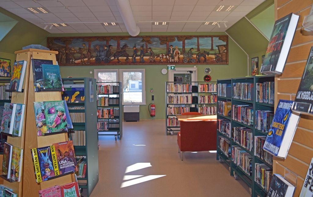 – Det blev bra, det har varit jätteroligt att få vara med från början av byggprojektet och det är lite annorlunda än att vara i Skillingehus där man inte gjort någonting på länge. Vi började flytta hit böckerna 12 mars så vi har jobbat snabbt när vi väl fick nycklarna. Vi har jobbat paralellt med byggjobbarna och i fredags var det ventilatiosfirma, elfirma, byggfima, städ och låssmeden samt vi. Publika ytan är 150 kvadratmeter och sedan har vi ytterligare 50 kvadratmeter till personalutrymme och förråd. I Skillingehus var de publika ytorna 265 kvadratmeter, så det är lite mindre här. Det blir helt andra behov av övriga kontorsytor här än på Skillingehus. Rent praktiskt blev det bättre att ha personalutrymmen åt väster. Skulle vi haft personalutrymmen och toaletter åt öster så hade vi behövt bygga om. I den här publika lokalen var det den gamla lagerlokalen, högt i tak och ett orosmoment vi hade var innan man satte in taket här var akustiken, men som du hör så är det inga problem, det fungerar jättebra. I vindslussen utanför entrédörren kan man ställa barnvagnar och rullator. Det kanske är lite förvirrat att gå in från östra sidan men det är bara ett problem man har första gången man besöker biblioteket. Kul att vi kunde ta med godbitar av konsten från Skillingehus.