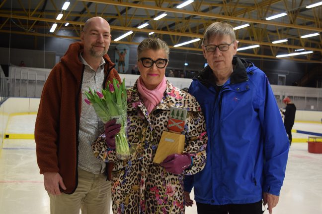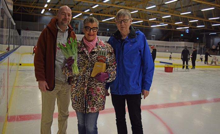 Vandringspris och blomster lämnades över av Per Bunnstad, som grundade priset 2003, och Jan Adler, kassör i Skillingaryds Intresseförening, i hockeyrinken till Carina Remnemark.