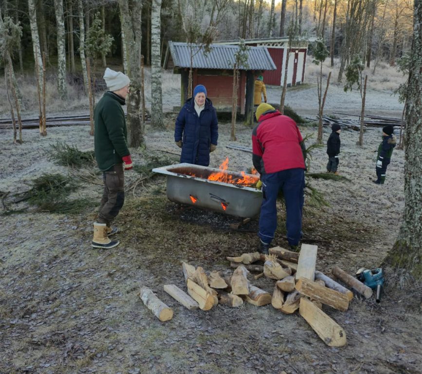 Efter en snabbgenomgång av hantverket av åldermannen P O Toftgård, testades de olika momenten. Snart var gänget uppdelat på två grupper och byggandet satte fart.