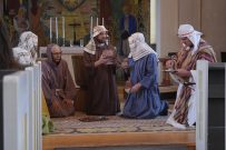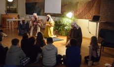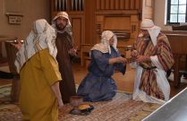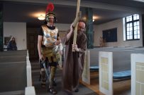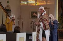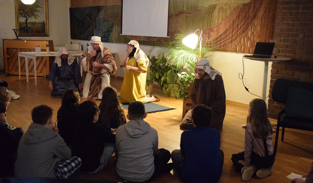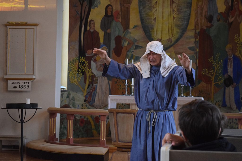 Maria berättar: ”Jag kommer från en by som heter Magdala. Jag har varit med om något så häftigt. Jag trodde aldrig det här skulle hända mig. Är ni bra på att resa i tiden? Det här var en spännande tid, det var den allra värsta men också den bästa också. Nu kliver vi in i berätteslsen och räkna bakåt från tre, vi snurrar ett varv för att hjälpa till att resa tillbaka i tiden”. Dörren till kyrkan öppnades och där mötte eleverna möter Jesus och några av hans lärjungar.