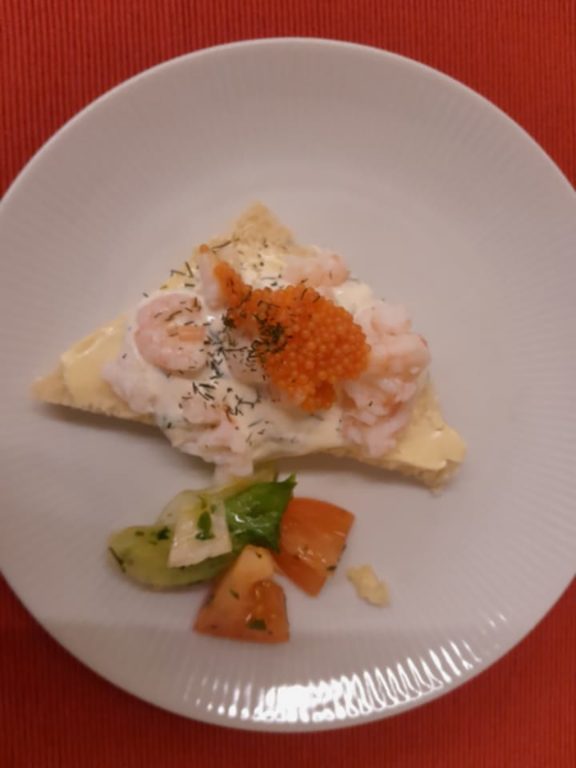 Till förrätt stod det skaldjurssnittar på menyn, till varmrätt serverades nötstek med potatisgratäng och rödvinssås och desserten bestod av vaniljpannacotta med bärsås. Mums, vilket käk!