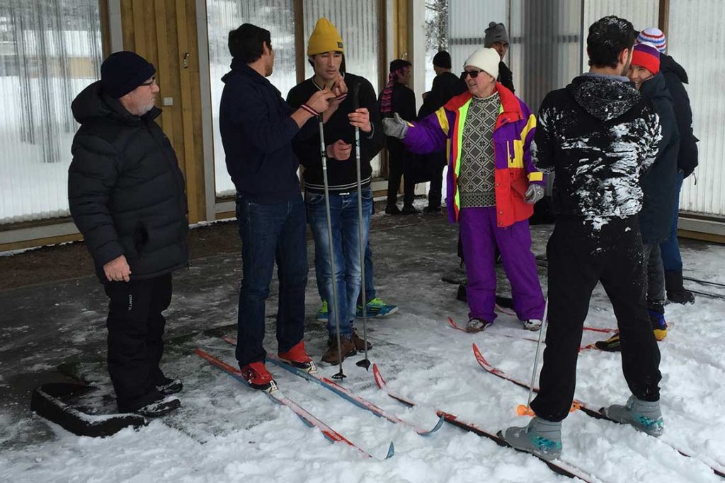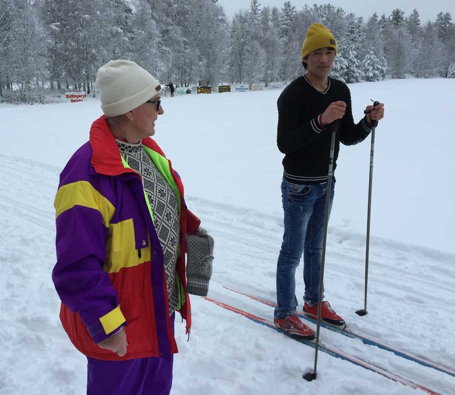 Gunnel ”I Backen” Johansson från Skillingaryd är alltid idérik och nu hade hon tagit initiativ till skidåkning för de flyktingar som bor i Götaströms Värdshus strax intill golfbanan.