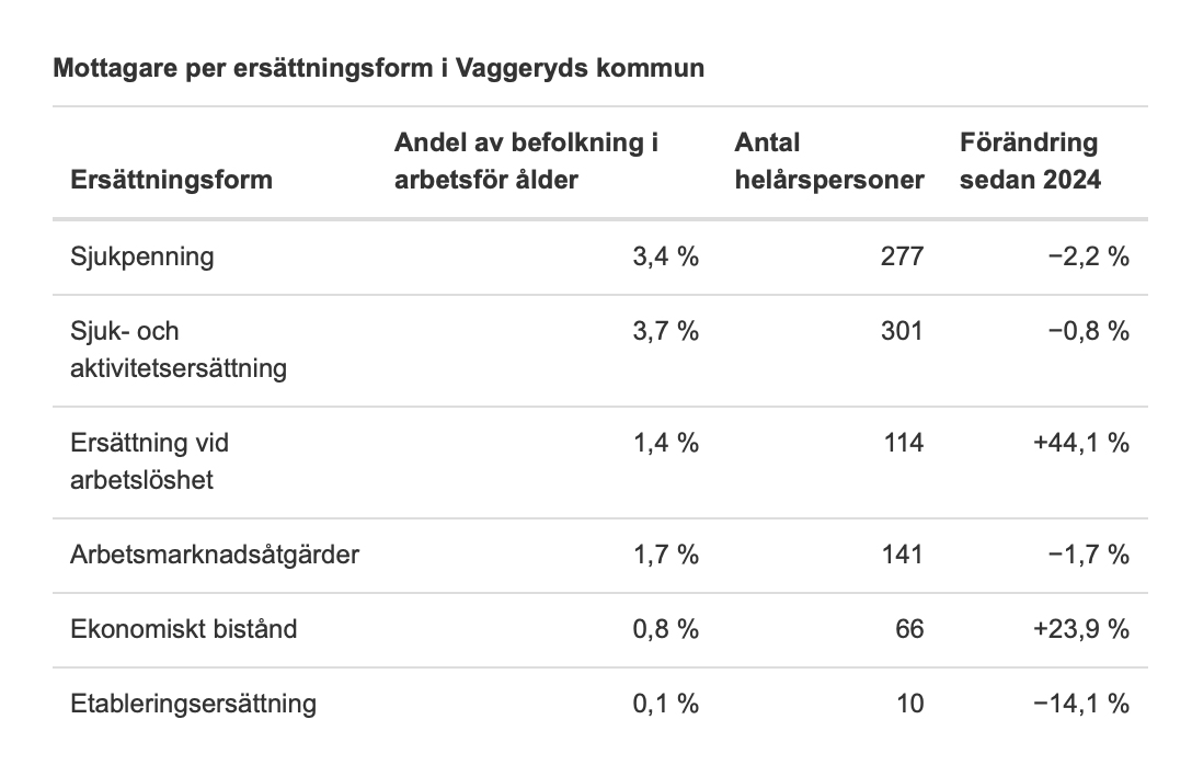När det gäller sjukpenning minskade istället antalet så kallade försörjda helårspersoner i Sverige. I Vaggeryd var antalet med sjukpenning relativt oförändrat förra året, motsvarande 277 personer.