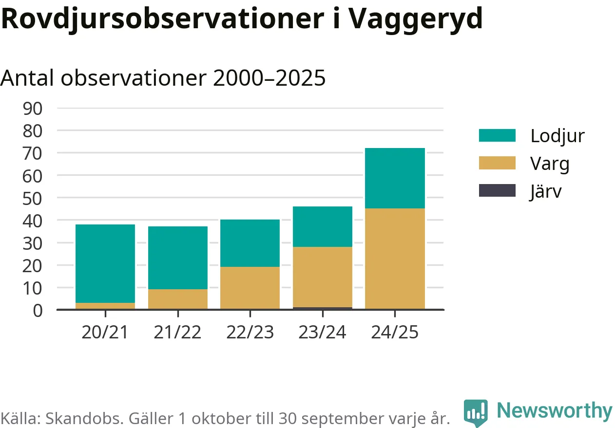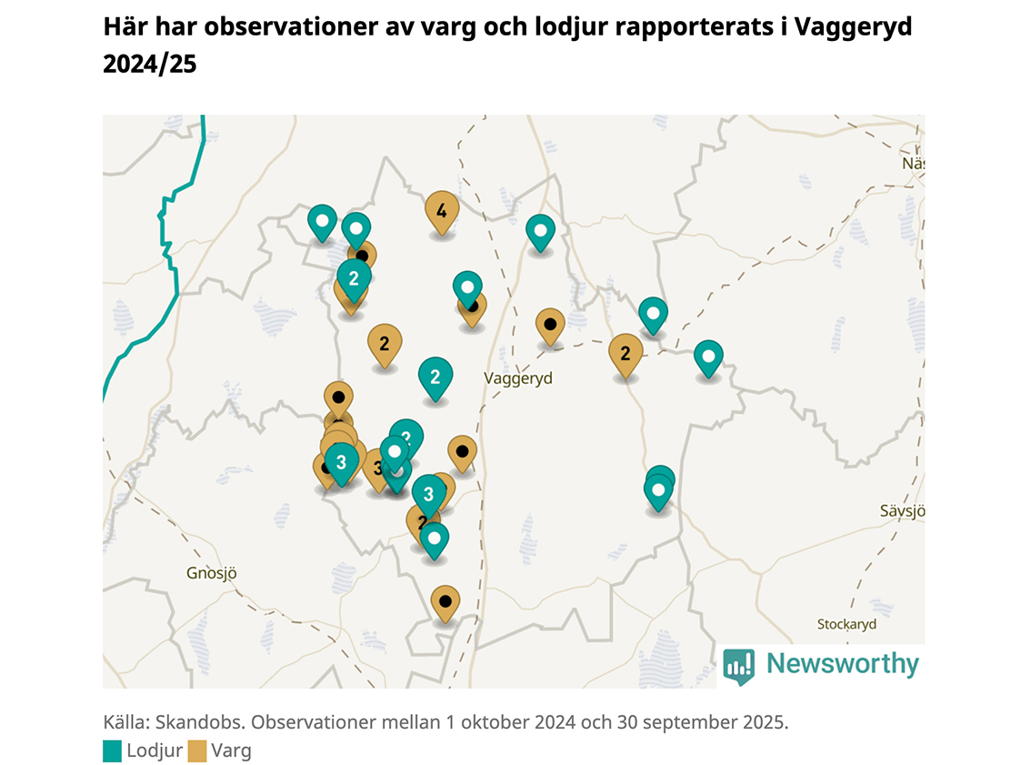 Där kan vem som helst rapportera sina observationer av de stora rovdjuren björn, varg, lodjur och järv. Mellan 1 oktober 2024 och 30 september i år har knappt 10 000 observationer registrerats i landet. Det kan vara synobservationer, foton, spår, spillning, döda bytesdjur eller andra tecken på rovdjursförekomst. I Vaggeryds kommun handlar det om totalt 72 observationer av varg eller lodjur.
