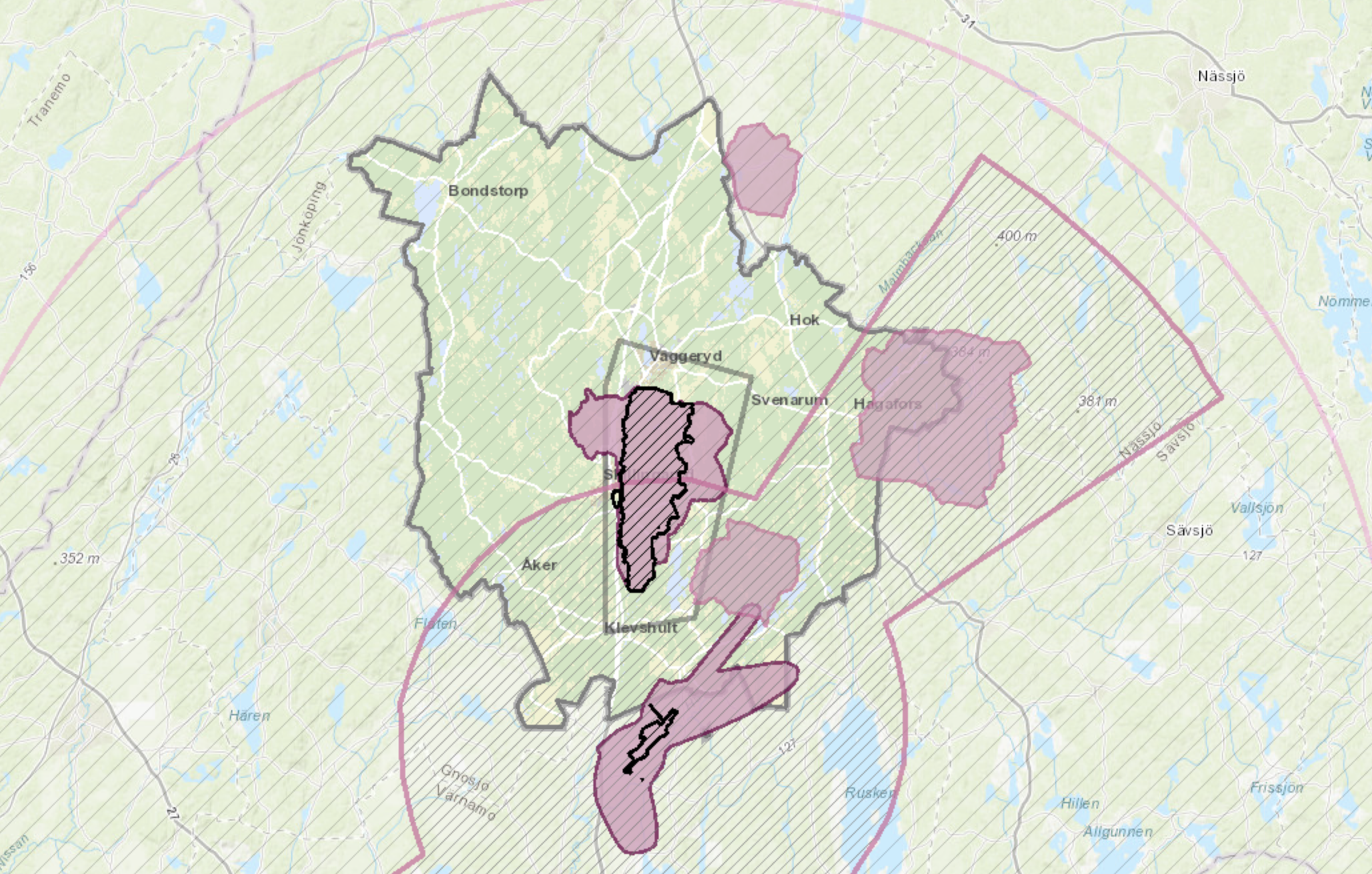 Vi har influensområdet som sträcker sig öster om E4;an, mellan Skillingaryd och Vaggeryd och en liten bit över Båramoområdet, som är känt av alla vid det här laget. Två områden, ett sydost om influensområdet samt vid Hagafors/Långserum, är markerat som ”påverkansområde övrigt”.