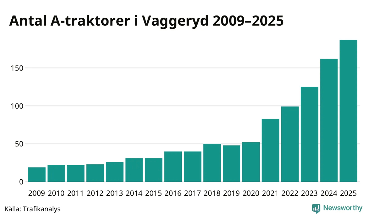 Nyheter Under det senaste decenniet har antalet A-traktorer femdubblats i Sverige och under 2025 fortsatte utvecklingen. I Vaggeryds kommun ökade antalet registrerade bilar med 15 procent. Ökningen för hela Jönköpings län hamnade på 13 procent.