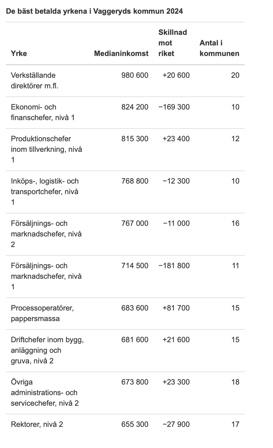 Nyheter Verkställande direktörer tjänar bäst i Vaggeryds kommun – och de har bättre inkomst här än genomsnittskollegan i landet. Det visar en sammanställning som SCB gjort. Se listan över kommunens bäst betalda jobb här.