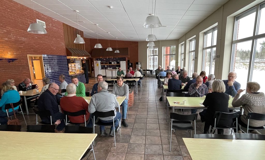 Så blev det dags för fika med en stor överraskning: kanelbulle + vaniljhjärta. Fler frågor haglade också över guidegruppen bland annat varför vi såg så lite arbetare när vi lufsade runt? En klyftig pensionär trodde att fler syntes till vid avlöningen. Chokladhjärtan delades ut som tack för att vi fick komma till detta underbara ställe av glädje och nytta för oss i SPF i Bor-Rydaholm.