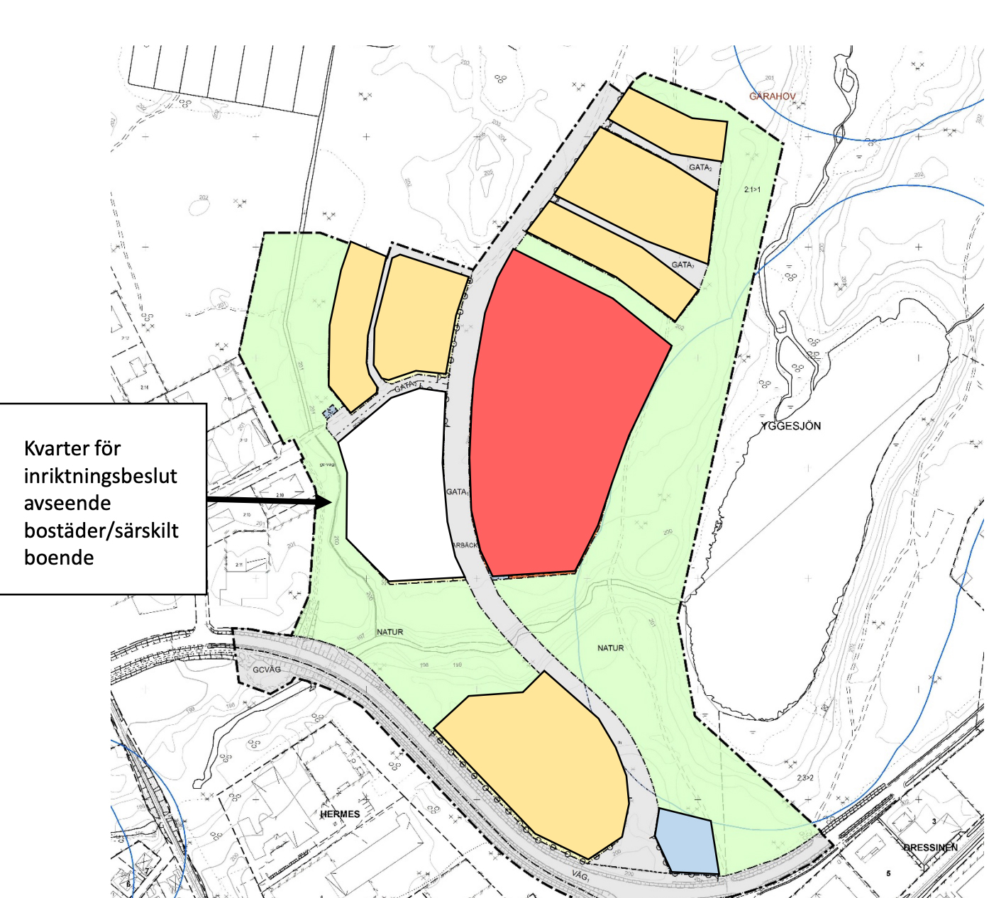Det är det vita området som har diskuterats i arbetsutskottet. Majoriteten vill placera särskilt boende här.