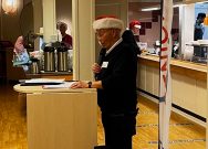 Anders Mattsson uppmärksammade Ingeborg Edqvist för hennes trettiofemåriga engagemang med musiksammankomster på Furugården i Vaggeryd. Hela 33 gånger har Ingeborg genomfört dessa under 2025 och Anders uppvaktade med en blomsteruppsats.