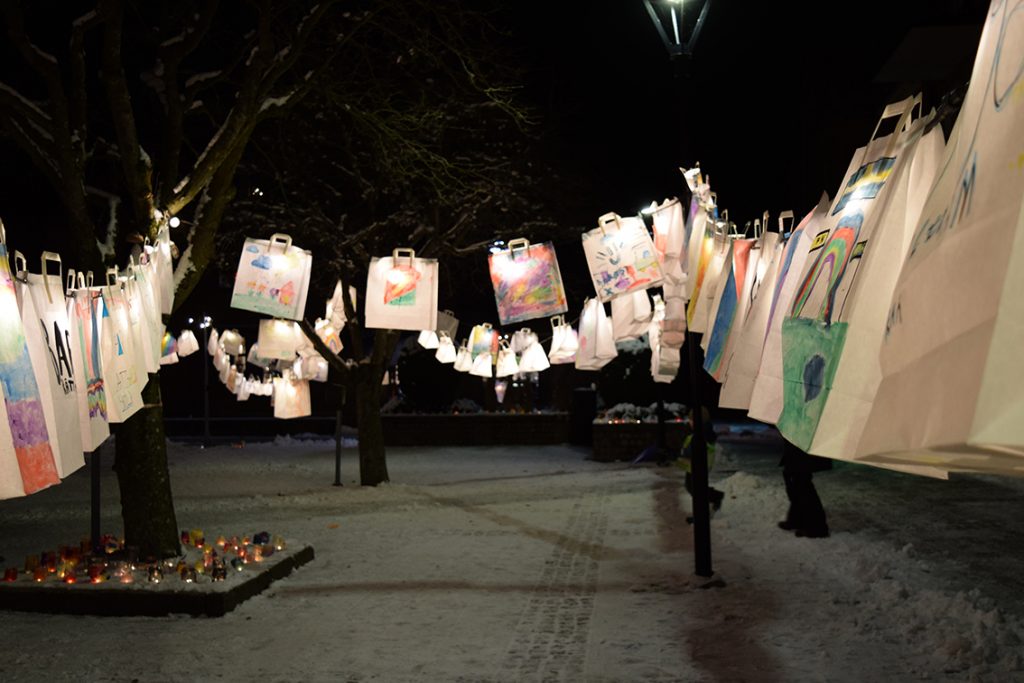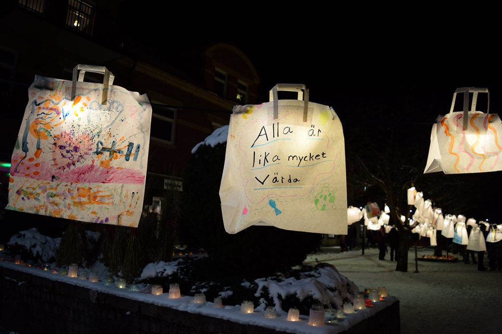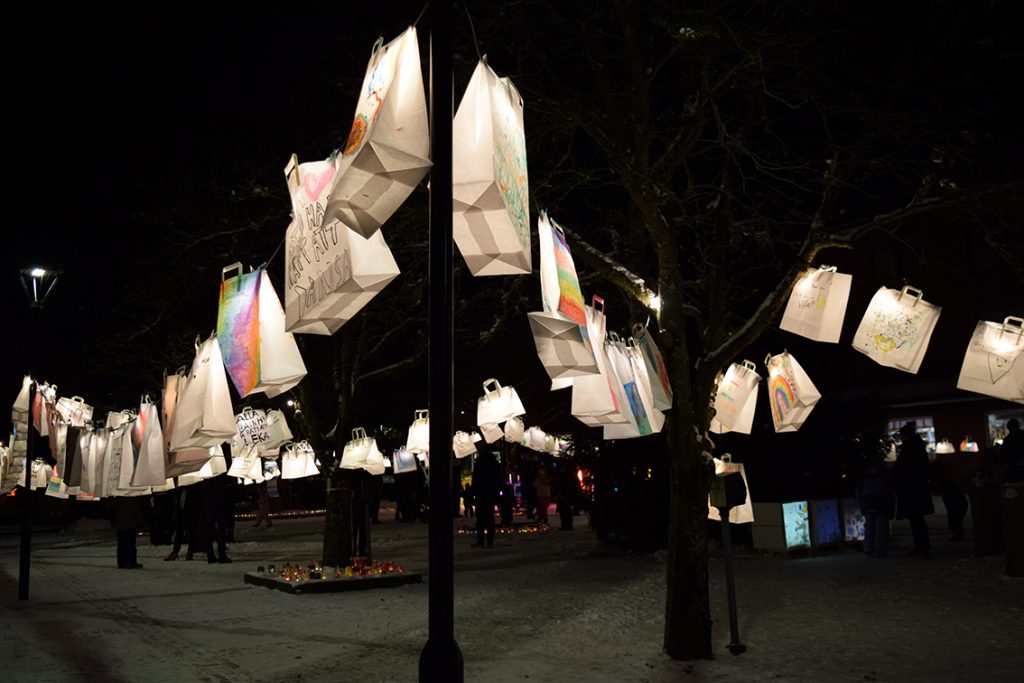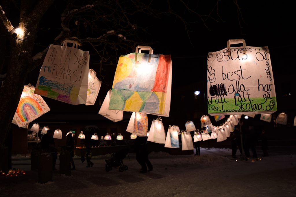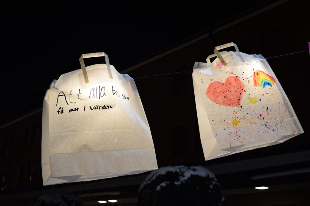 – Alla elever i årskurs tre i kommunen har gjort totalt över 200 påsar och man har skrivit sina tankar kring barnkonventionen. 700 ljusen har förskolebarnen tillverkat. Eleverna har sett sin påse och de påsar sin klass gjort och här får man se det hela. UC/UG  har öppet i kväll och diskjockey förser oss med musiken.