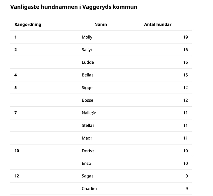 Nyheter Molly toppar hundnamnsligan i Vaggeryds kommun, precis som i landet som helhet. Men ett namn på topplistan utmärker sig som ovanligt vanligt: Nalle. Det visar färsk statistik från Jordbruksverket.