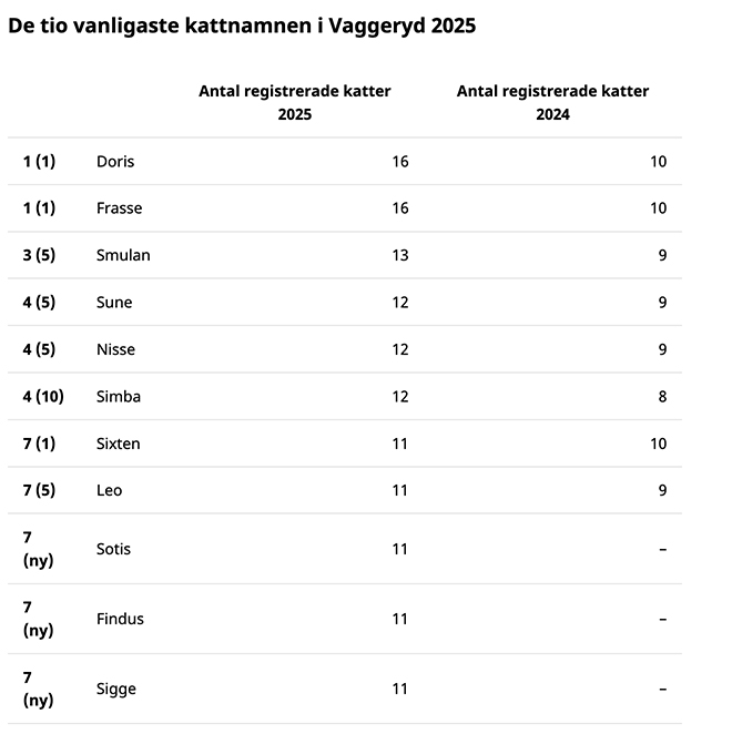 Doris och Frasse tronar fortsatt på förstaplatsen på listan över de vanligaste kattnamnen i Vaggeryd. Den 31 december 2025 fanns det 16 registrerade katter som lystrade till dessa båda namn i kommunen, vilket är tre katter mer än Smulan på tredjeplatsen. Det visar Jordbruksverkets senaste statistik.