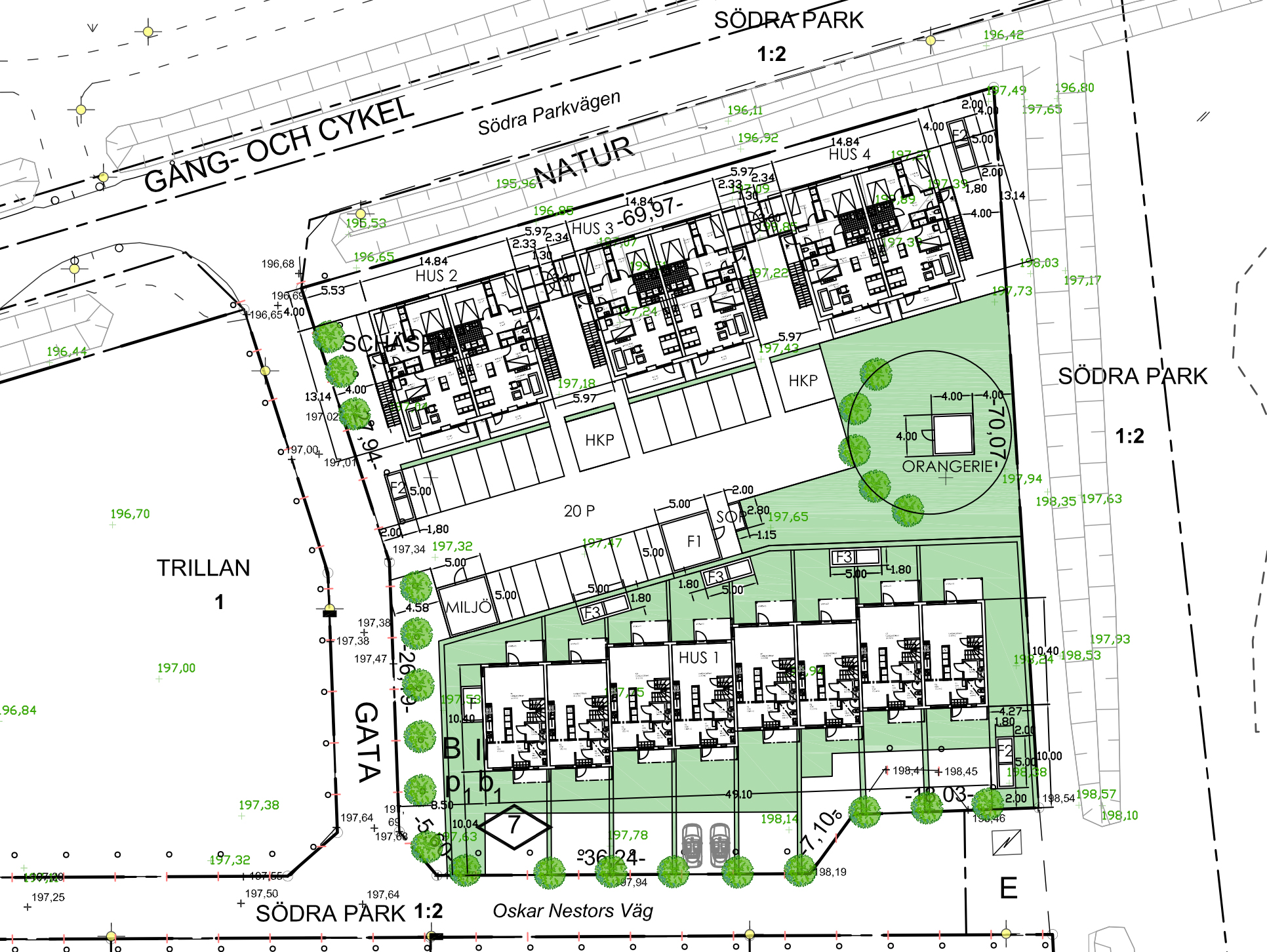 ”Under hela bygglovsprocessen har kommunens tjänsteperson vid upprepade tillfällen försäkrat oss om att alla in- och utfart till parkeringsytor ska ske från Johan Rehns väg via en intern kvartersgata. Det beviljade bygglovet anger att miljö- och byggnämnden att in- och utfarterna sker från Johan Rehns väg. Trots detta har parkeringsytor och kvartersgata inom Trillan 1 anlagts på ett sätt som möjliggör, och i praktiken inbjuder till, trafik från Oskar Nestors väg. Nu beviljas bygglov för Schäsen 1 som bland annat innefattar åtta radhus. På nybyggnadskartan ses dessa entreér och uppställningsplatser för två bilar vardera med utfart till Oskar Nestors väg. Nämnden har i sitt beslut bemött våra synpunkter kring fler utfarter mot Oskar Nestors väg med formuleringen ”enligt det beviljade bygglovet på kvarteret Trillan 1 sker in- och utfart från Johan Rehns väg och får anses vara säkerställt”. Vi anser att detta är en otillräcklig bedömning. Trafikförhållanden på Oskar Nestors väg är inte tillräckligt utredda och nämndens bedömnin av in- och utfarter från Trillan 1 är bristfällig och återspeglar inte den faktiska situationen.