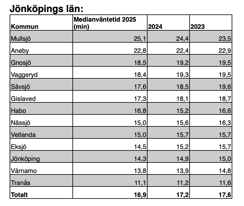 För Jönköpings län var det 2 procent som fick vänta 25 minuter eller mer och 41 procent var väntetiden 15 till 20 minuter. 4 procent av larmen kom ambulansen 20-25 minuter. Bland de tio längsta väntetiderna i landet under 2025 placerades sig Mullsjö kommun på tionde plats där mediantiden var 25,1 minuter.