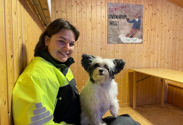 Vi träffar henne och hunden Bubbel inne i värmestugan bredvid liften där de värmer sig.