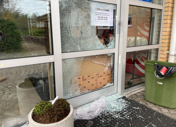 När personalen kom till jobbet i morse möttes de av krossat glas från butikens glasdörrar. Bild: Jenny Almlöf
