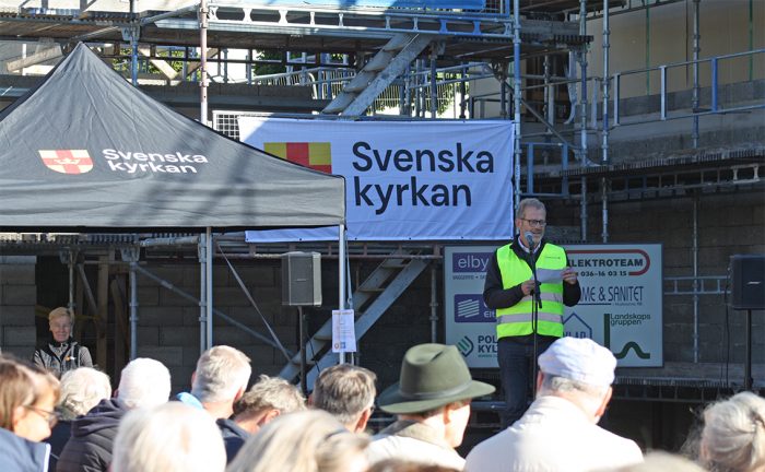 Så sa kyrkorådets ordförande Mats Bergman i sitt tal i går när över hundra personer kom och firade taket på det nya bygget vid Byarums kyrka. Kransen hängde på gaveln. Alla var samlade, så väl kyrkans personal, folk som jobbar med bygget, som människor från stiftet och medlemmar i församlingen.