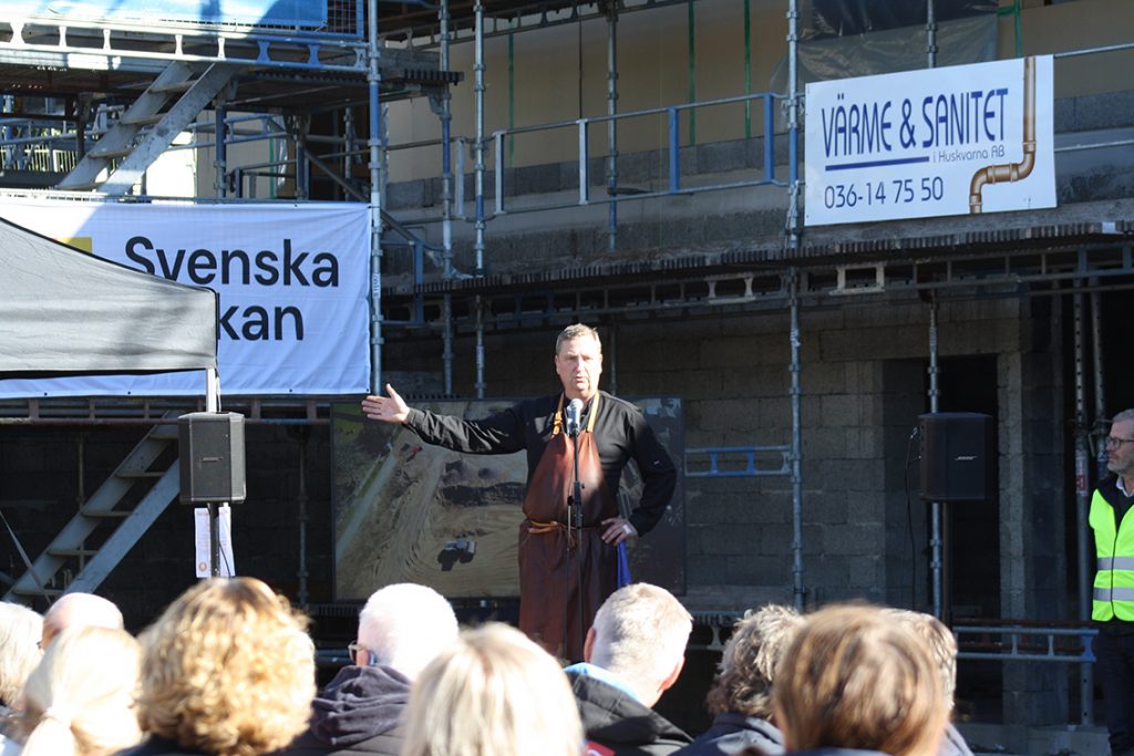 Stiftsgården Tallnäs stod för maten, en riktigt stor kyckling wok, som gott och väl räckte för alla. Taklagsfesten inleddes med tal och hyllningar. Målet är att bygget ska certifieras enligt miljöbyggnad silver. Miljöbyggnad är ett certifieringssystem inom hållbart byggande, som främjar energi-och resurshushållning. I bygget vid kyrkan använder man byggmaterial med låg klimat- och miljöpåverkan, tillvaratar regnvatten för bevattning och man återbrukar möbler och annan inredning, berättade Sara Nodmar, klimatstrateg på Växjö stift, i sitt tal.