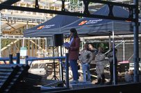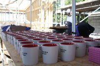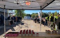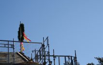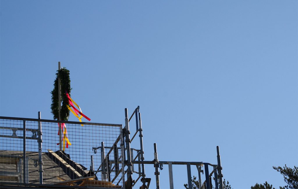Nu är stommen till taket på plats och pappen på det. Så nu klarar sig byggnaderna ifall det skulle komma någon regnskur. Kransen är upphängd och denna milstolpe är firad med taklagsfest. Allt enligt konstens och traditionernas regler. Och det här är en dag i gemenskapens tecken menar Lars Andersson: