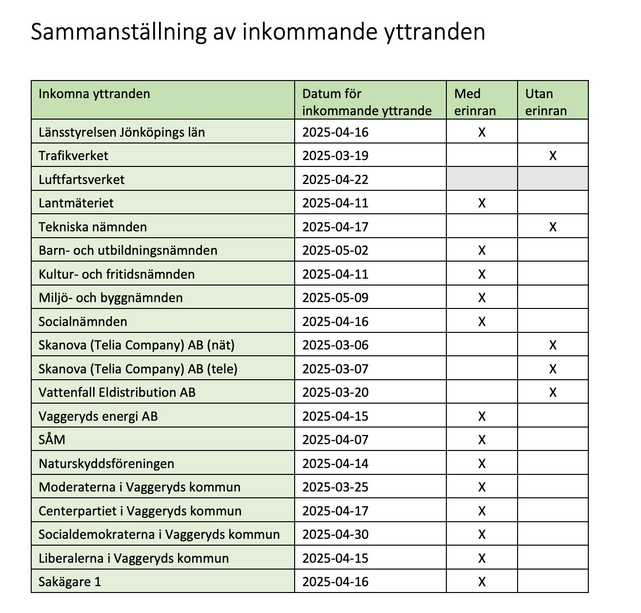 Flera insatser har fått säga sitt i arbetet och de som inte har några invändningar är: Trafikverket, tekniska nämnden, nät- och teleoperatör Telia samt Vattenfall. De som inkom med invändningar i sitt yttrande var: länsstyrelsen, Lantmäteriet, barn- och utbildningsnämnden, kultur- och fritidsnämnden, miljö- och byggnämnden, socialnämnden, Vaggeryds Energi AB, SÅM, Naturskyddsföreningen, Moderaterna, Centerpartiet, Socialdemokraterna, Liberalerna och sakägare.