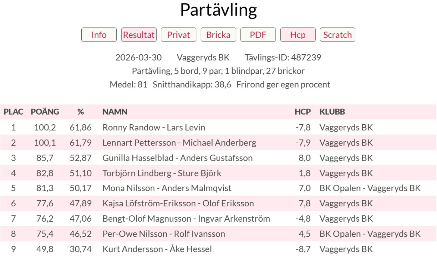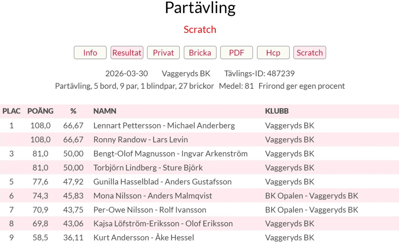 Fyra herrar i bridgetoppen 31 mars, 2026 12:01 Bridge Det har spelats bridge hos Vaggryds BK. Här är resultaten. Taggar Bridge Vaggeryds Bridgeklubb Dela