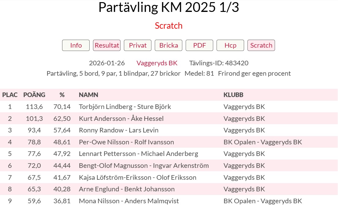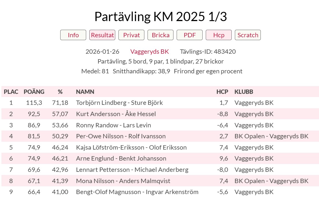 KM: Partävling i bridge är avgjord 27 januari, 2026 09:03 Bridge Torbjörn och Sture toppar i klubbmästerskaps-bridge. Under måndagens arrangerades klubbmästerskap hos Vaggeryds Bridgeklubb, nedan presenteras resultatet. Taggar Bridge Klubbmästerskap Vaggeryds BK Dela
