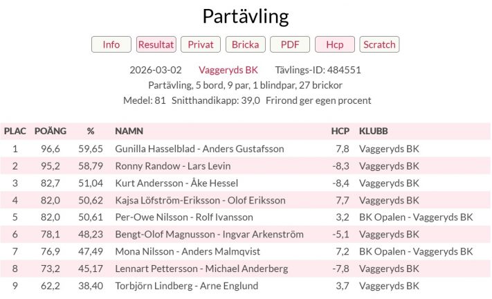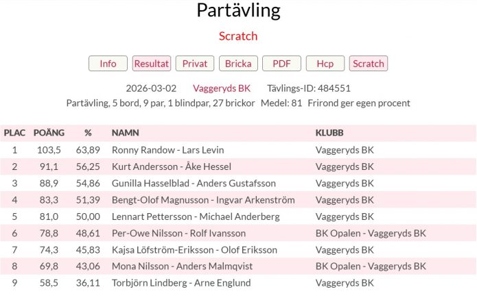 Ronny, Lars, Gunilla och Anders toppade veckans bridge 3 mars, 2026 09:59 Bridge Två partävlingar i bridge har Vaggeryds BK anordnat, med fem bord, nio par och 27 brickor. Här är resultatet. Taggar Vaggeryds BK Dela