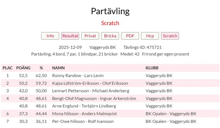 Vinnarna i gårdagens bridge 10 december, 2025 08:36 Bridge Det har spelats bridge i Vaggeryd. Här presenteras resultatet från i går tisdag. Taggar Bridge Vaggeryds BK Dela