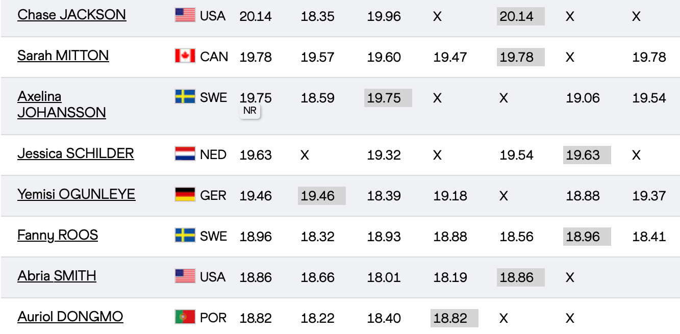 Axelina Johanssons serie: 18,59–19,75–ogiltigt–ogiltigt–19,06–19,54