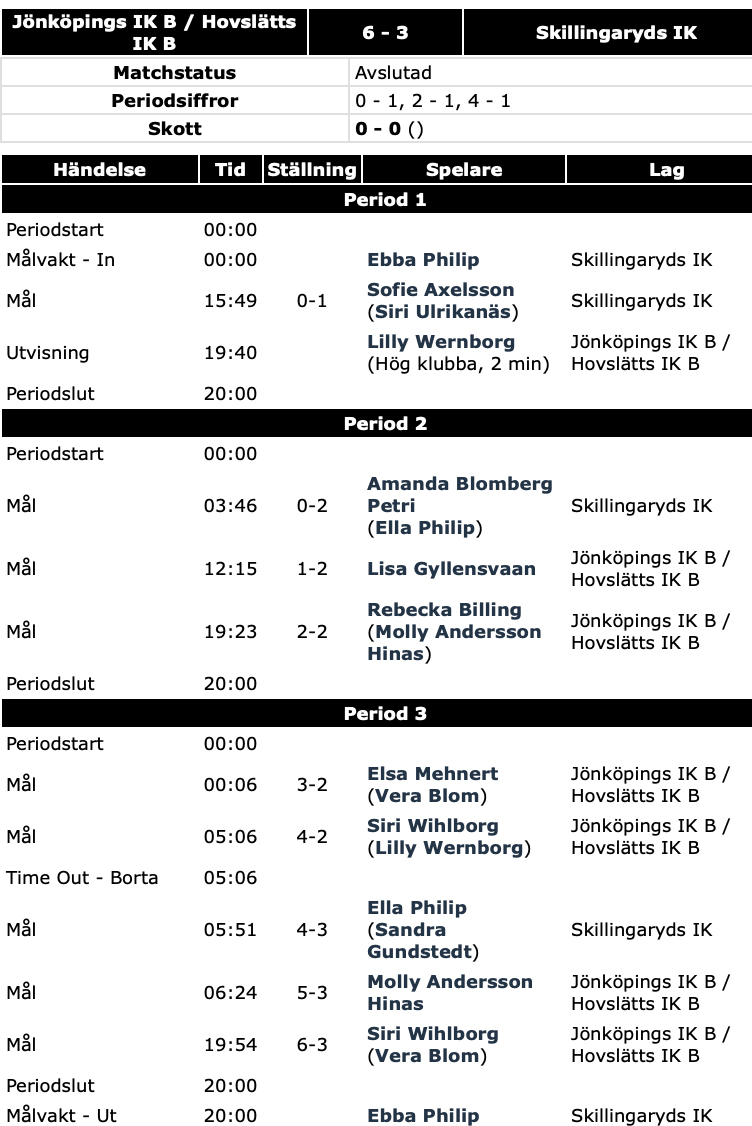 Innebandy Skillingaryds IK föll med 3–6 mot Jönköping/Hovslätt B i damtvåan. Uppdaterat.