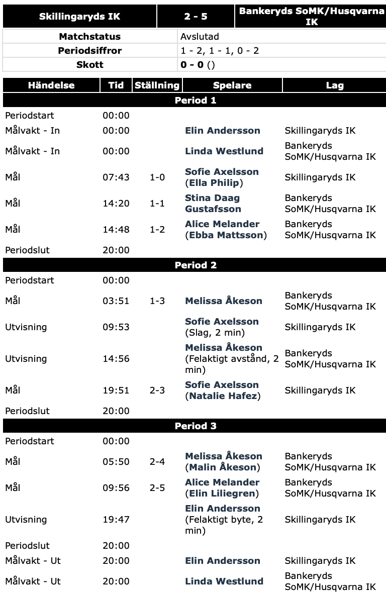 I tredjeperioden justerade man lite i laget och fick bra fart på spelet. Gästernas rutinerade målvakt räddade då ett flertal klara målchanser från SIK:s sida.