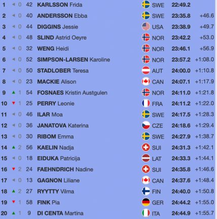 I tio kilometer fri stil blev det dubbelt svenskt i toppen genom Frida Karlsson och Ebba Andersson. Jessie Diggins från USA tog brons.