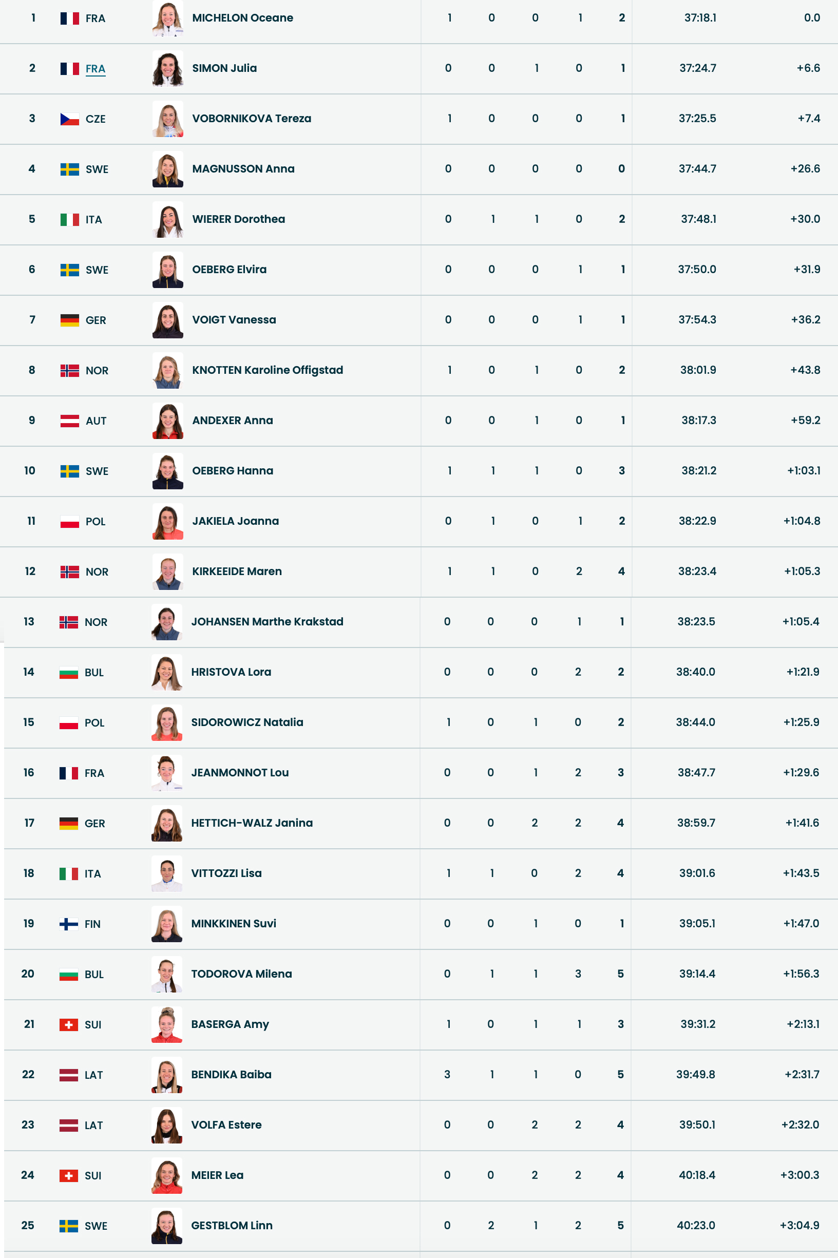 Det såg bra ut för svensk del inför det sista skyttet. Det var framför allt Elvira Öberg öppet hoppet stod till då hon låg trea. Tyvärr fick hon en bom och åkte ned till sjätte palts. Tvåa var i stället Anna Magnusson som blev tävlingens enda skytt med 20 träff av lika många möjliga. Anna kunde dock inte stå emot utan gick i mål som fyra.
