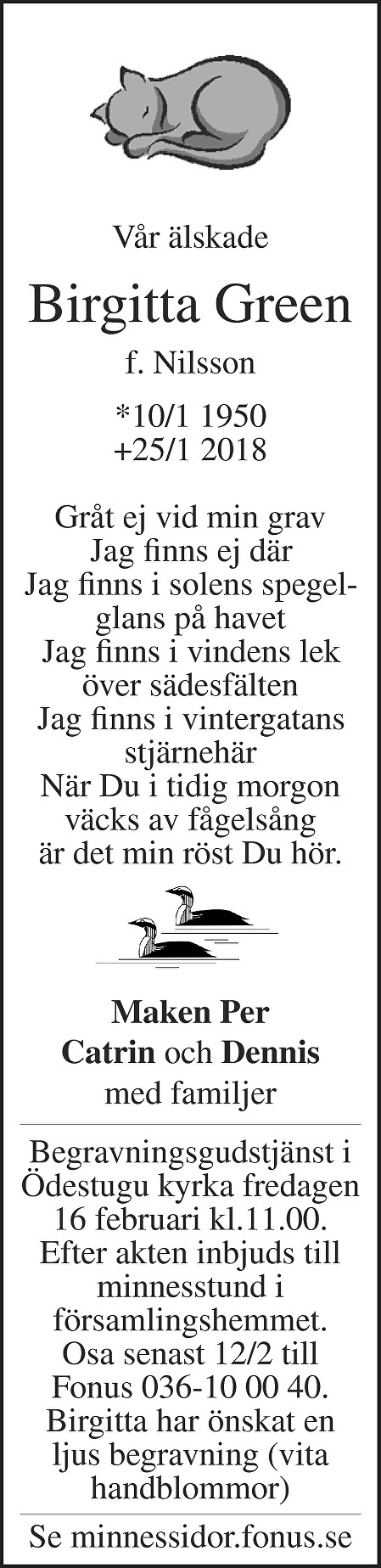 Birgitta Green – född Nilsson – avled den 25 januari 2018. Hon var född den 10 januari 1950.