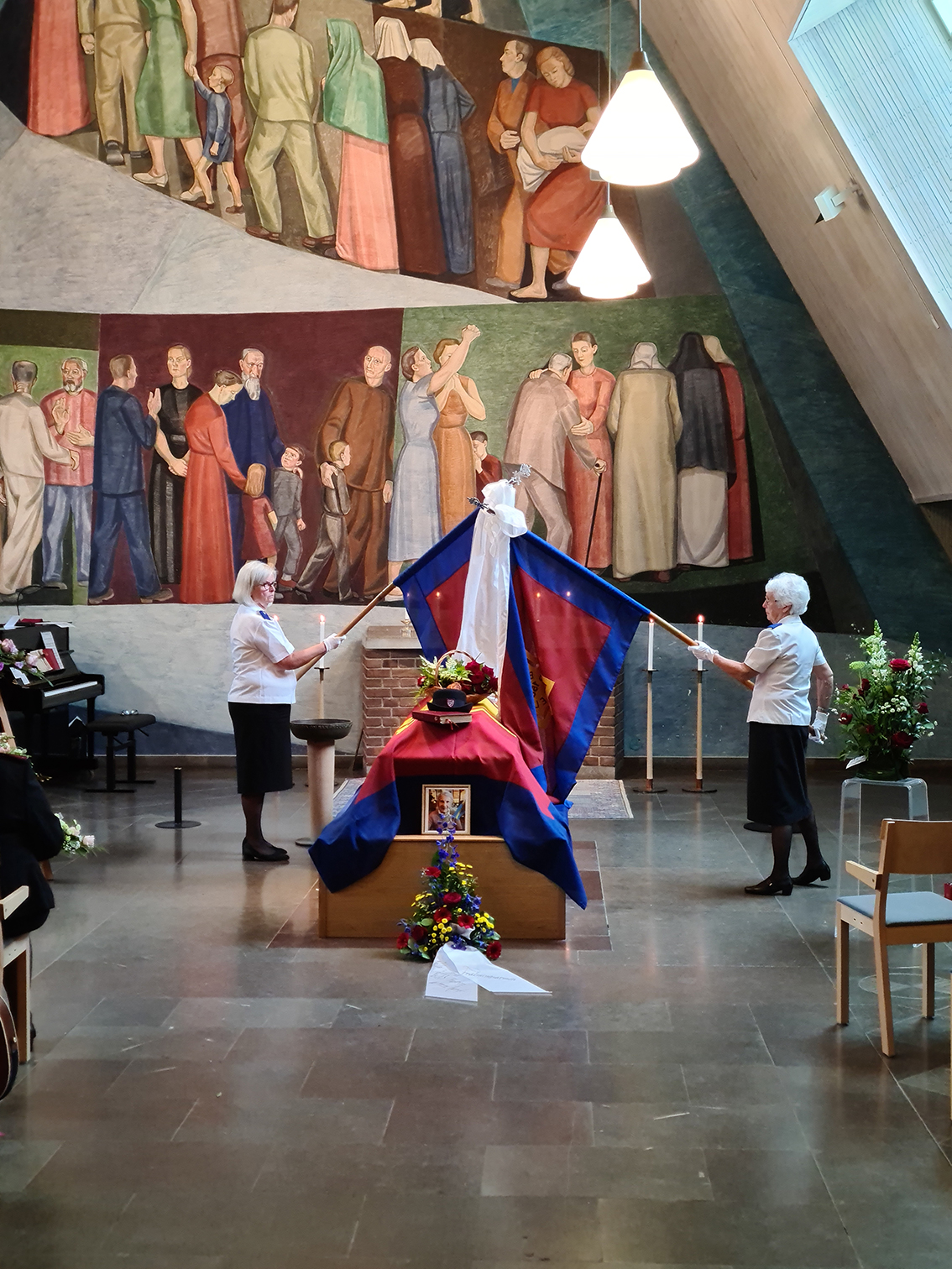 Vid kistan dekorerad med Frälsningarméns Fana tog vänner, grannar och kamrater från Frälsningsarmén ett stilla farväl. Efter avsked sänktes fanorna för salutering till en trogen soldat och därefter sjöng strängmusikkåren Om himlen ej finns ”R. Johansson”. Till avslutning spelades Gyllne stad med pärleportar ”H.S. Thompson” på piano.