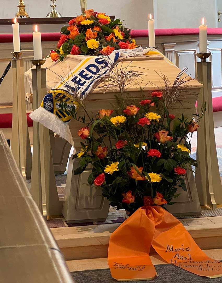 Vid den blomstersmyckade kistan tog makan Marie, barnen Axel, Ida och Emma med respektive, barnbarn, broder, svägerskor, svågrar, syskonbarn, övrig släkt, grannar, arbetskamrater och vänner samt representanter från Hooks IF, Skillingaryd.nu och Centerpartiet ett sista farväl.