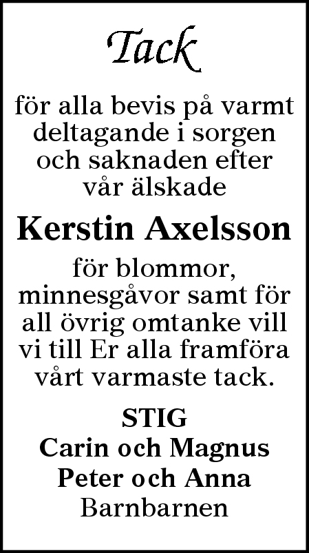 Begravning Till minne Kerstin Axelsson, Skillingaryd Publicerad 17 juli, 2021 00:02 Mer information Skriv en kommentar Avbryt svarKommentar * Genom att skicka kommentaren godkänner du vår GDPR-policy för kommentarer.Namn * E-postadress * Webbplats Spara mitt namn, min e-postadress och webbplats i denna webbläsare till nästa gång jag skriver en kommentar.