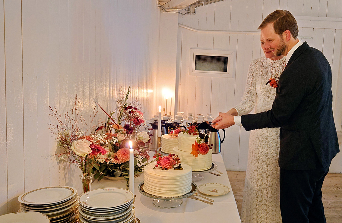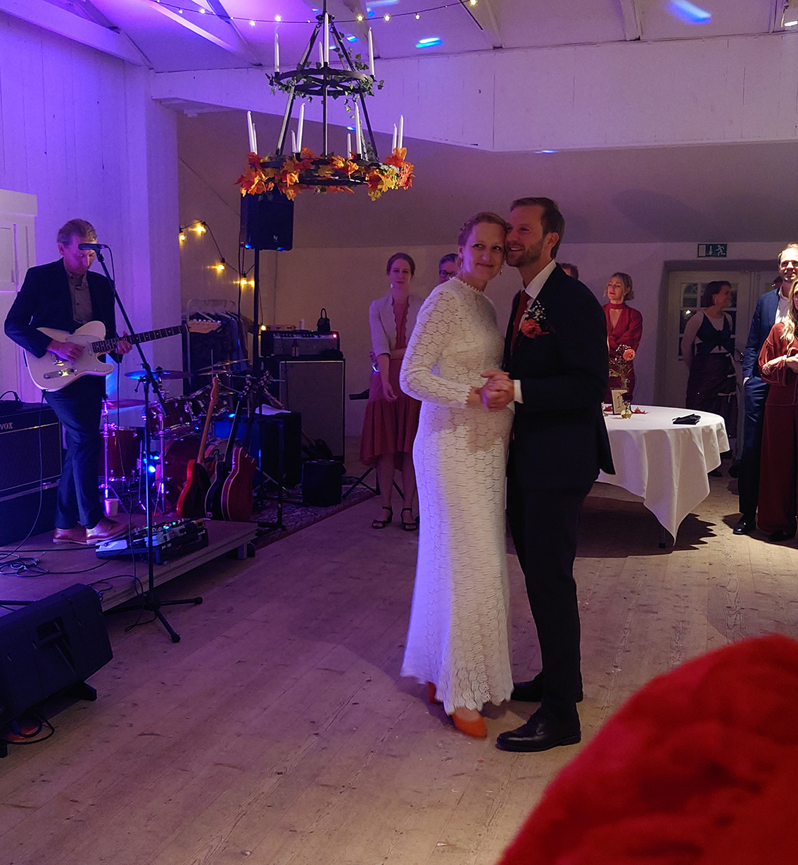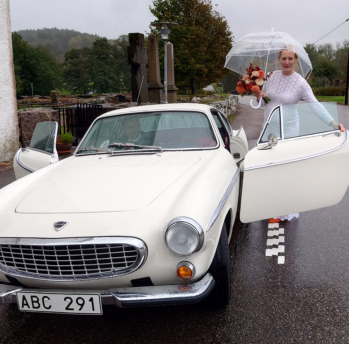På väg ut ur kyrkan bjöds alla gäster på kaffe och bulle. Efter sedvanlig fotografering färdades gästerna till Stora Holms säteri. Brudparet for i väg i en vit Volvo P 1800. Bruden jobbar på Volvo. Brudparet togs emot i orangeriet med gratulationer, kramar och hurrarop. Efter samling i stora festsalen bjöds på brudparets trattkantarellsoppa med svamp från de småländska skogarna. Festen fortsatte med en fantastiskt välsmakande meny, sång och musikinslag. På borden fanns ett festprogram med en kort beskrivning av alla gäster samt vackra blomdekorationer. Till slut mer sånger av gäster och brudparet samt brudvals.